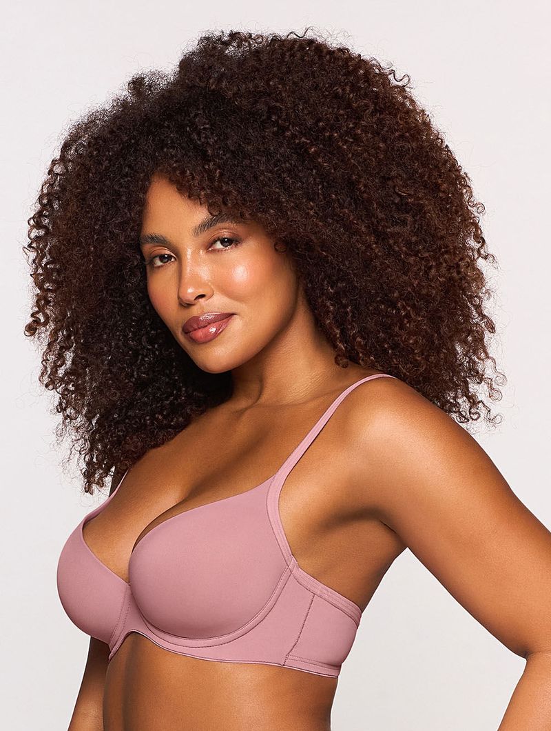 Sutiã em microfibra aveludada opaca com meia alça em viés, com aro e bojo com enchimento.